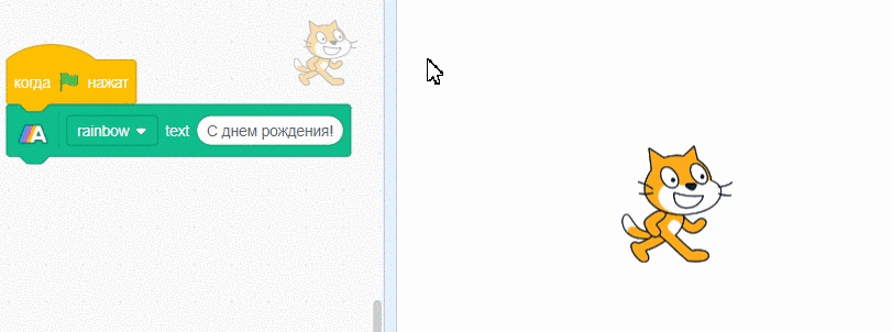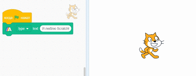 Как видите — это не совсем обычный Scratch, внизу добавлено новое расширение с блоками зеленого цвета. Соберите скрипт для надписи текста. Обратите внимание, теперь не просто спрайт произносит текст “в облачке”, теперь сам спрайт исчезает и вместо него появляется красивый текст.